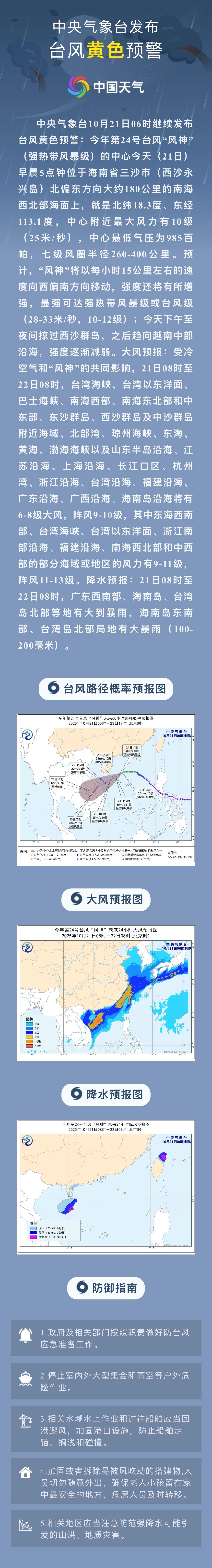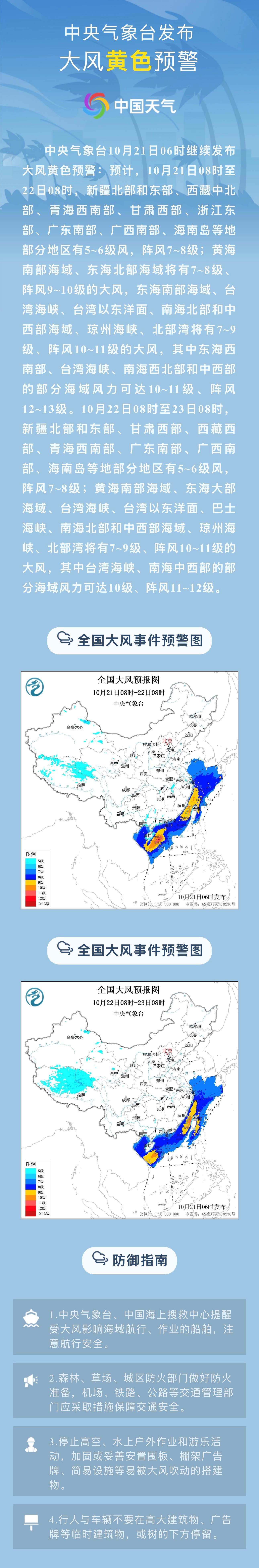 10月21日6时优配送,中央气象台继续发布台风、大风黄色预警: