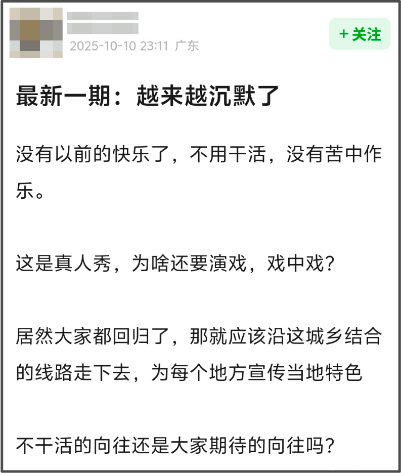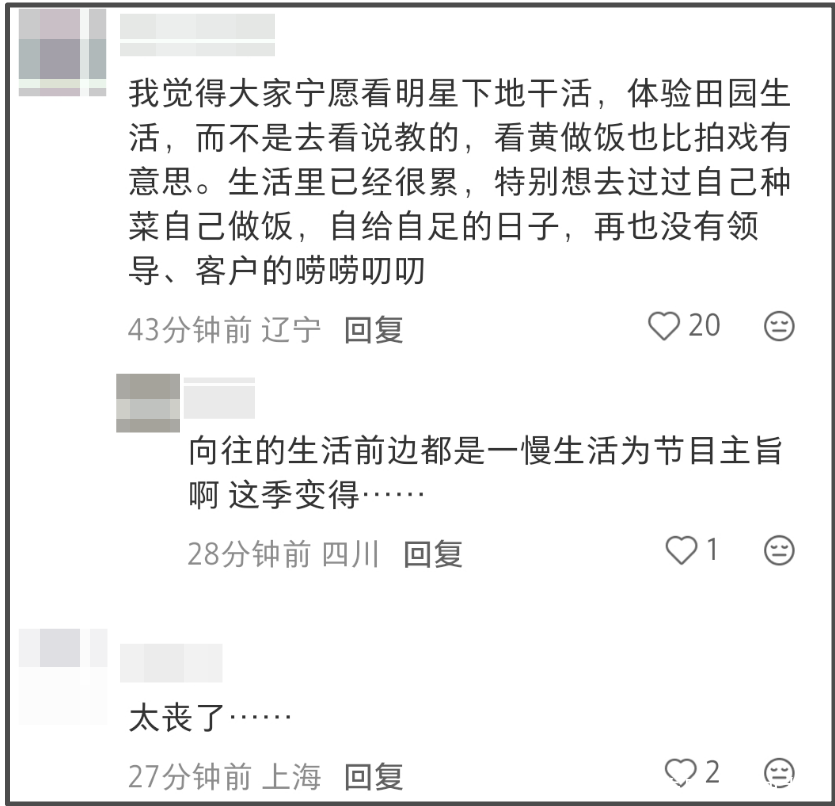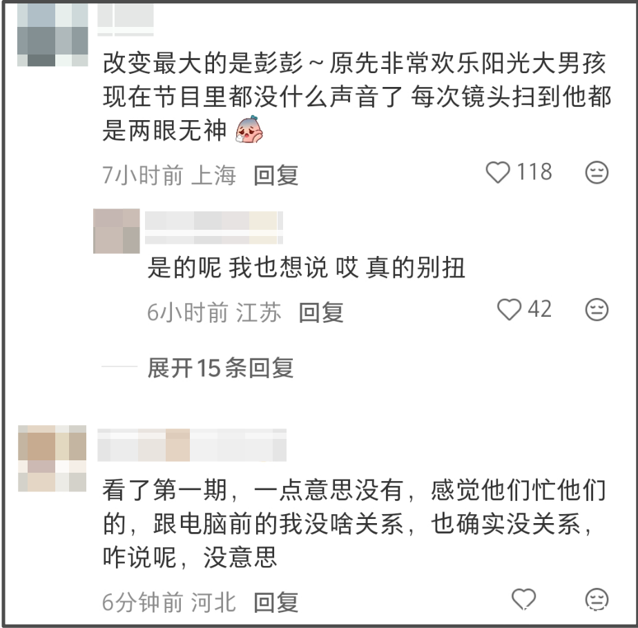 其实相较于节目形式,更多观众吐槽的是节目整体氛围感,给人的感觉越来越丧,看着一点都不开心,再没有苦中作乐了,观众只看到他们的苦,没办法感同身受他们的乐。