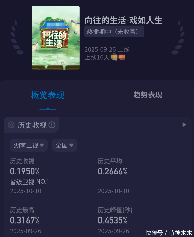目前《向往的生活》最新直播收视仅剩0.195%。