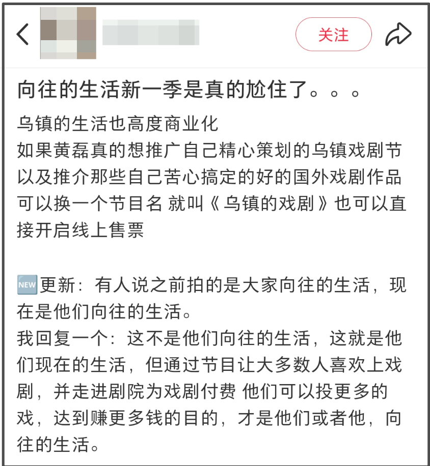 网友吐槽一针见血——“有人说之前拍的是大家向往的生活,现在是他们向往的生活。我回复一个:这不是他们向往的生活,这就是他们现在的生活,但通过节目让大多数人喜欢上戏剧,并走进剧院为戏剧付费,他们可以投更多的戏,达到赚更多钱的目的,才是他们或者他,向往的生活。”